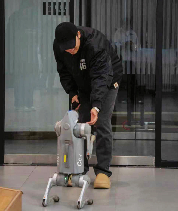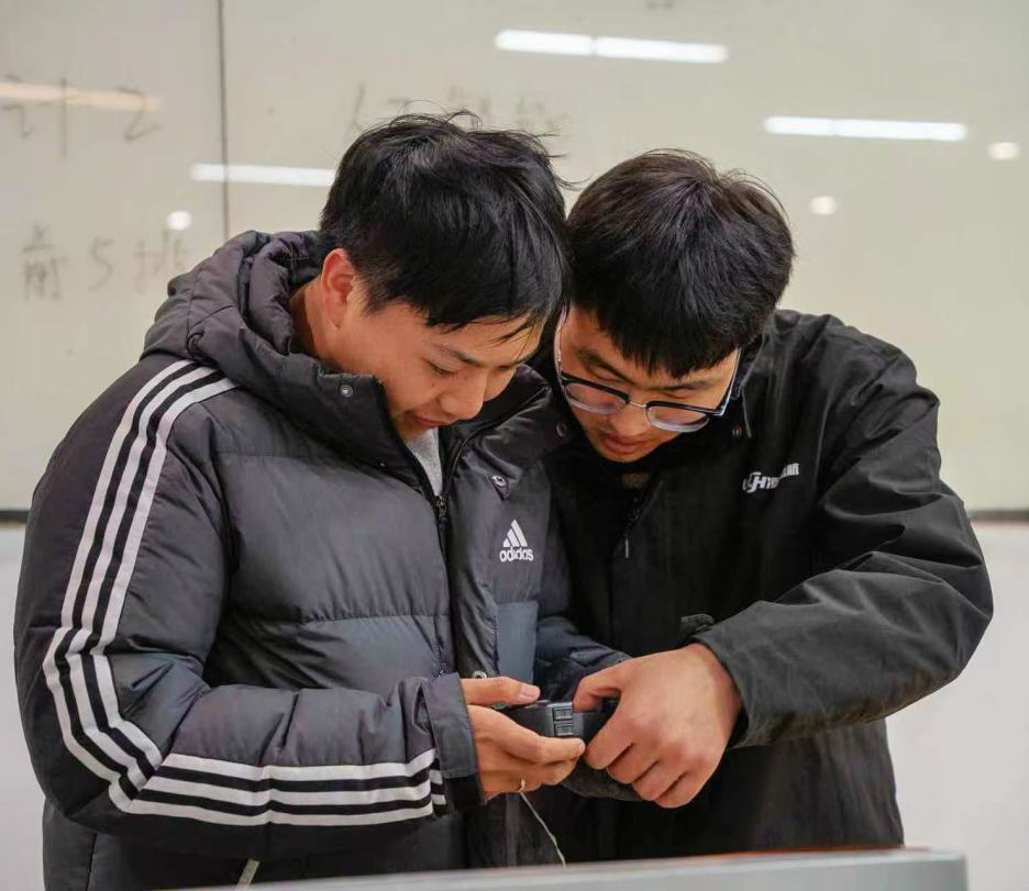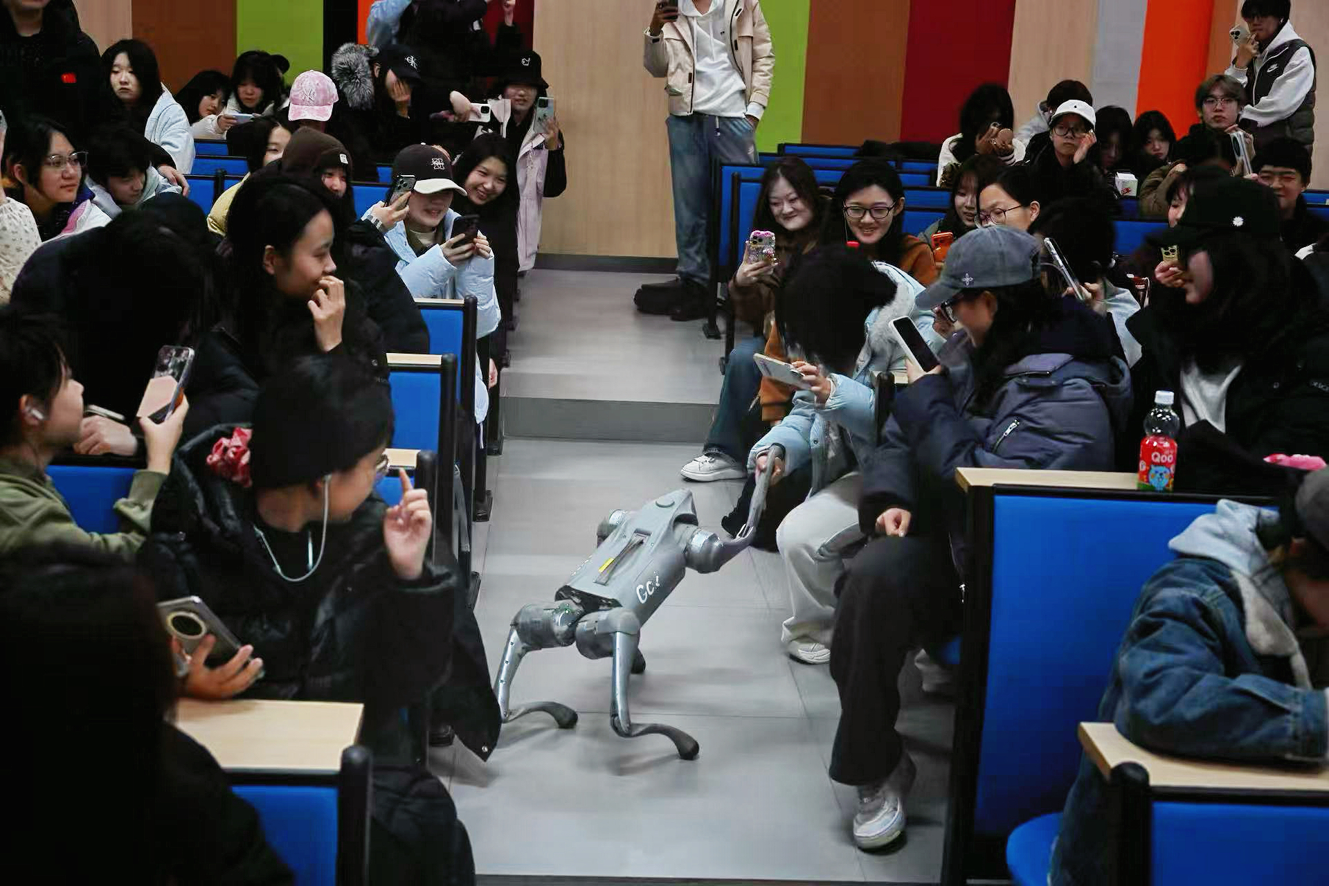 而灵动可爱的机器狗,更是点燃了现场氛围。同学们围在机器狗身边,与它击掌、互动,看着它灵活转身、回应指令,亲身感受人工智能技术的趣味性与实用性。不少同学拿起手中的大疆设备,追拍机器狗的每一个灵动瞬间,用镜头记录下科技与欢乐碰撞的珍贵画面,在互动中激发创意灵感,也对“智能设备与传媒场景的融合”有了更直观的认知。
